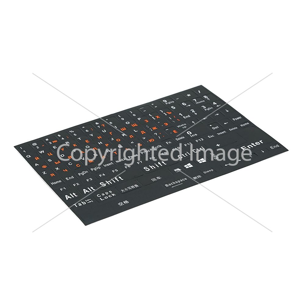 Наклейки на чорну клавіатуру з білими англ. літерами та помаранчевими Укр та Рус.літерами, Q500