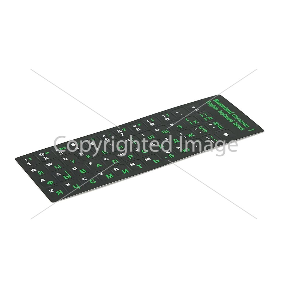 Наклейки на клавіатуру чорні із зеленими літерами Англ.Укр.Рус.. Q500