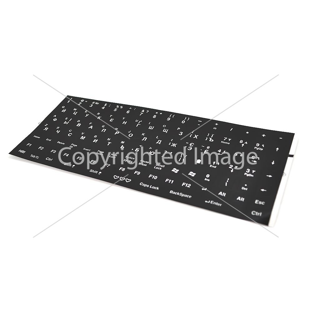 Наклейки на матовій чорній клавіатурі з білими літерами Укр.Рус.Англ., Q500