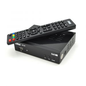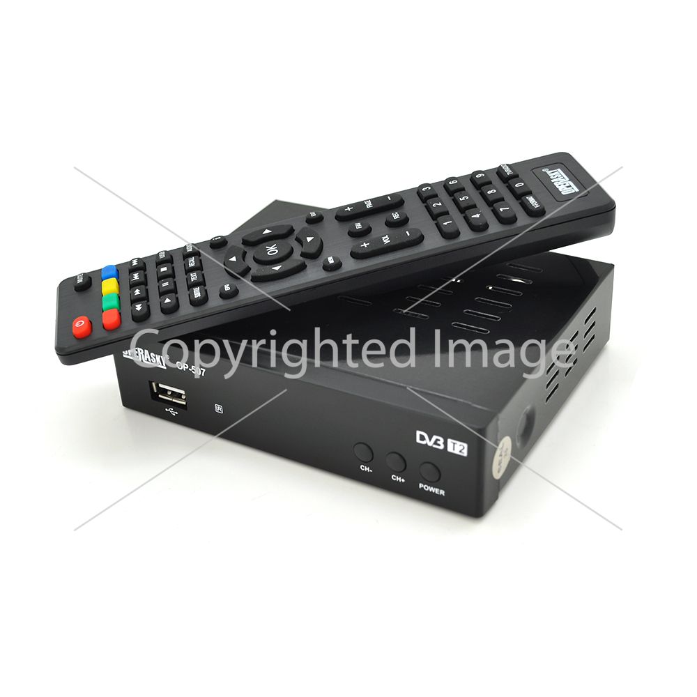 Ресивер (тюнер) IPTV DVB-T2 OPERASKY OP-507 - цифровий ефірний приймач з пультом дистанційного керування в компактному пластиковому корпусі, кнопками керування та індикатором номера каналу на передній панелі.