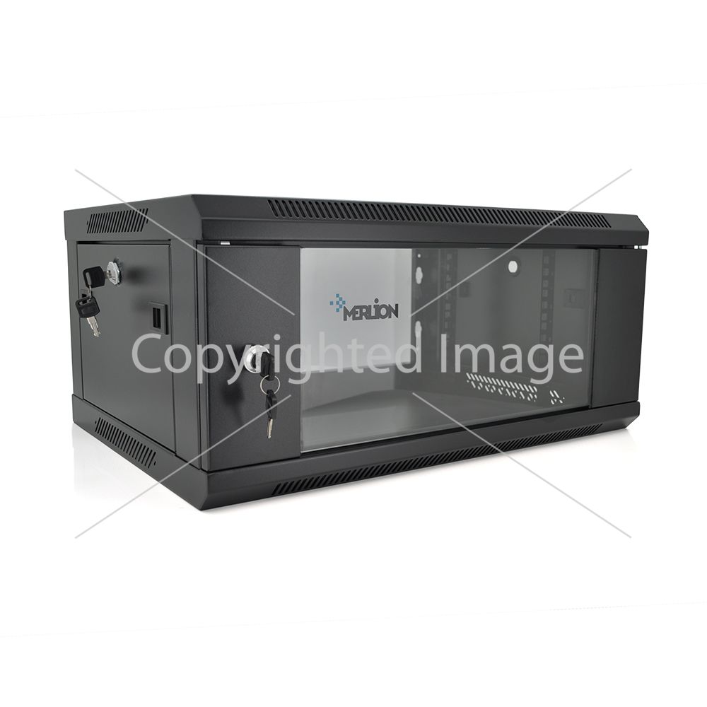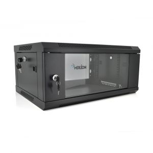 Шафа Merlion 4U. Привабливий зовнішній вигляд, двері із загартованого скла, непомітний чорний колір. У верхній кришці шафи передбачено місце для встановлення вентилятора охолодження. Зовнішня висота складає 279 мм, зовнішня глибина – 600 мм. Бічні двері – знімні на замках. Передні двері із загартованого скла з наявністю замку для запобігання небажаному доступу до обладнання.
