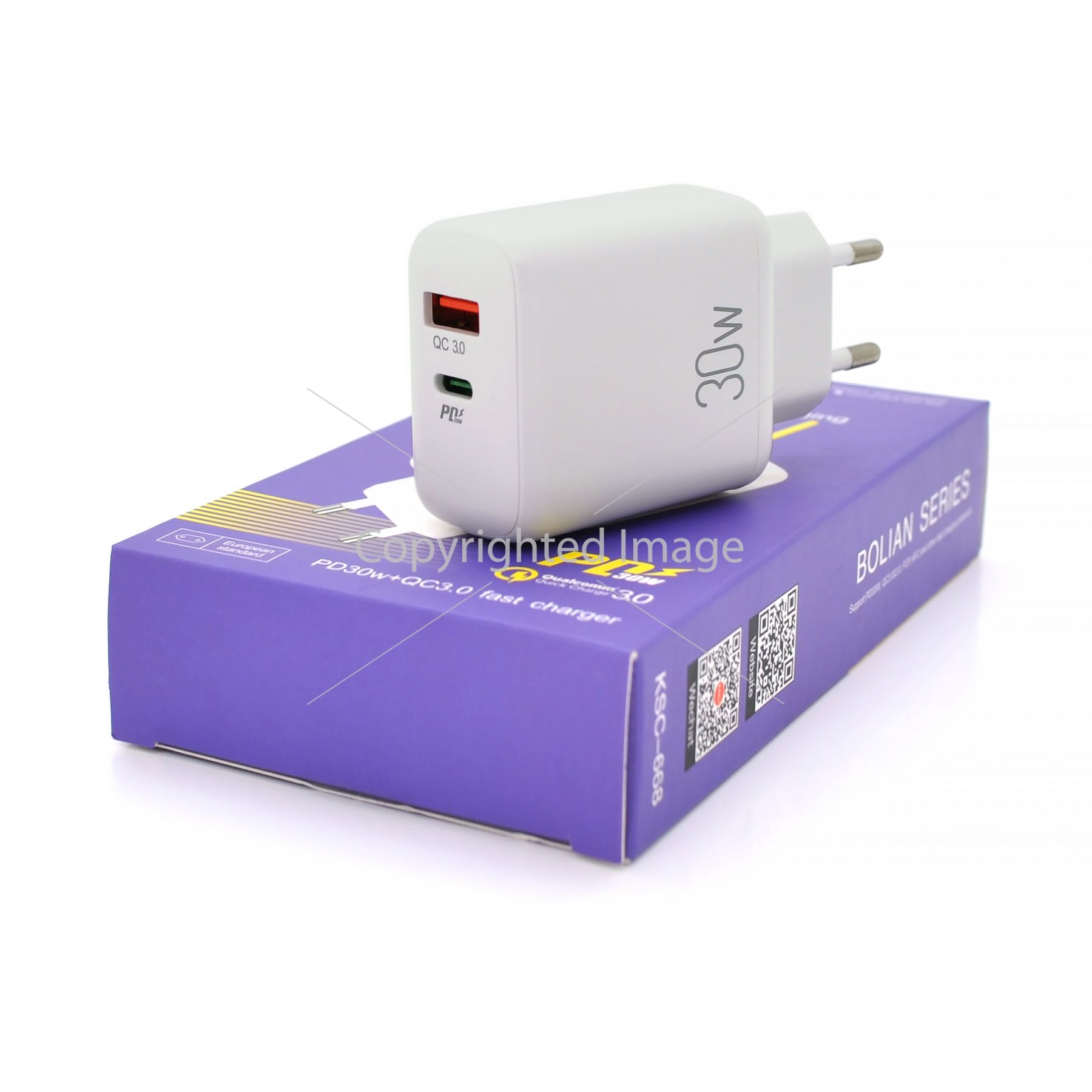 СЗУ AC100-240V iKAKU KSC-668 BOLIAN PD30W+QC3.0 Dual Port charger, White, Box