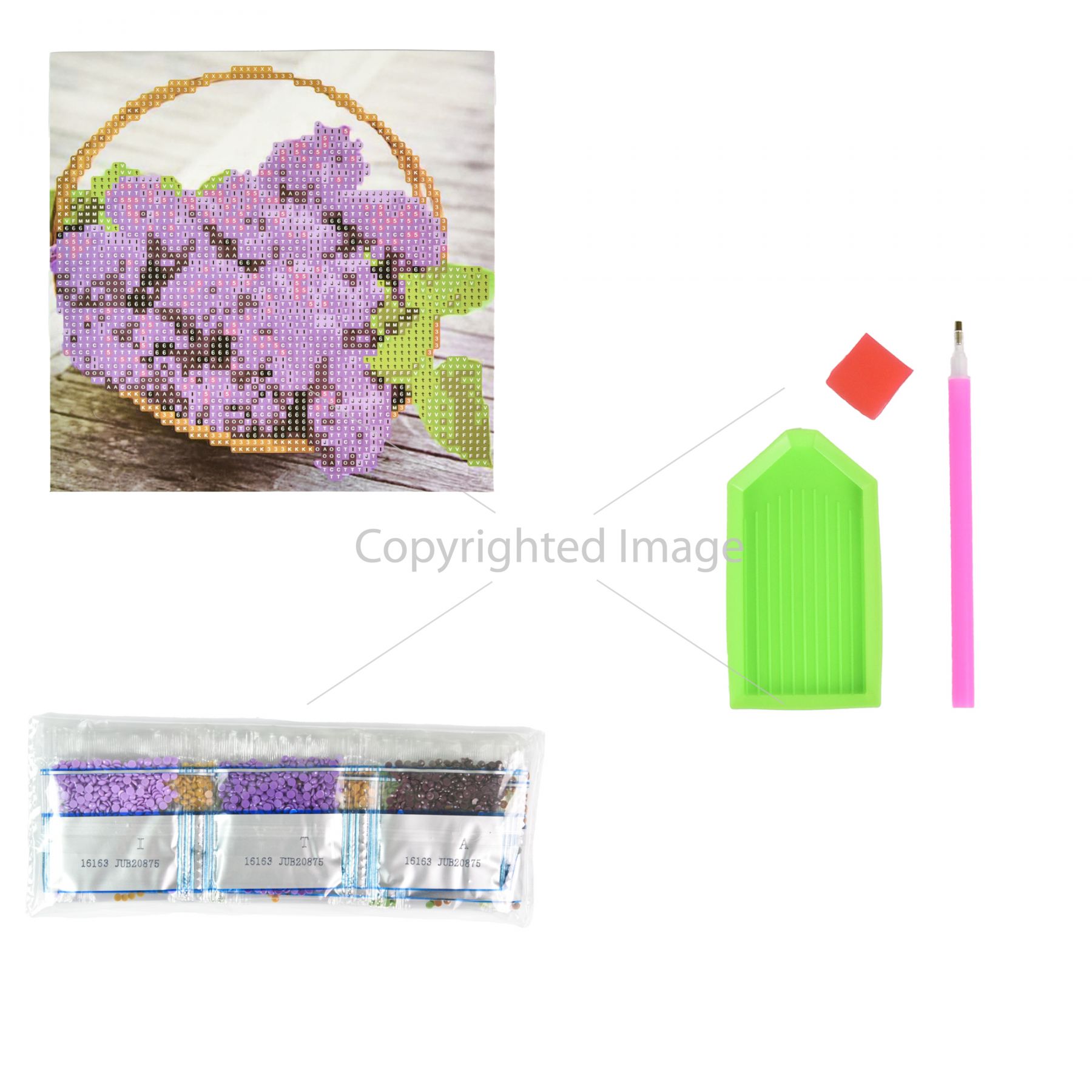 Комплектація:Полотно із клейовим шаром; акрилові стрази згідно з комплектацією набору; спеціальна ручка-стилус для роботи зі стразами; гель-клей; лоток для сортування страз.