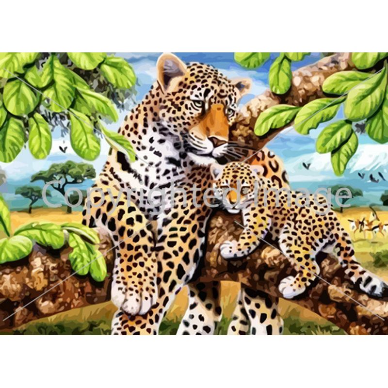 Алмазна мозаїка Strateg ПРЕМІУМ Леопард з дитинчатою без підрамника розміром 50х65 см (SGK76327)