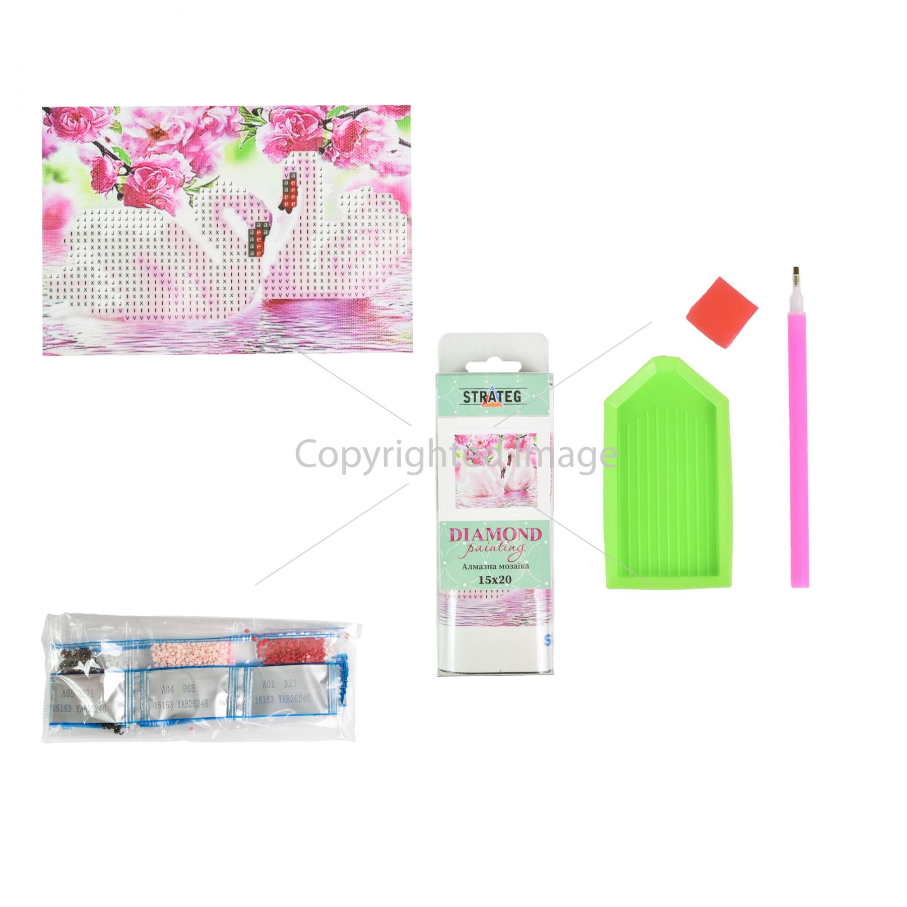 Комплектація:Полотно із клейовим шаром; акрилові стрази згідно з комплектацією набору; спеціальна ручка-стилус для роботи зі стразами; гель-клей; лоток для сортування страз.