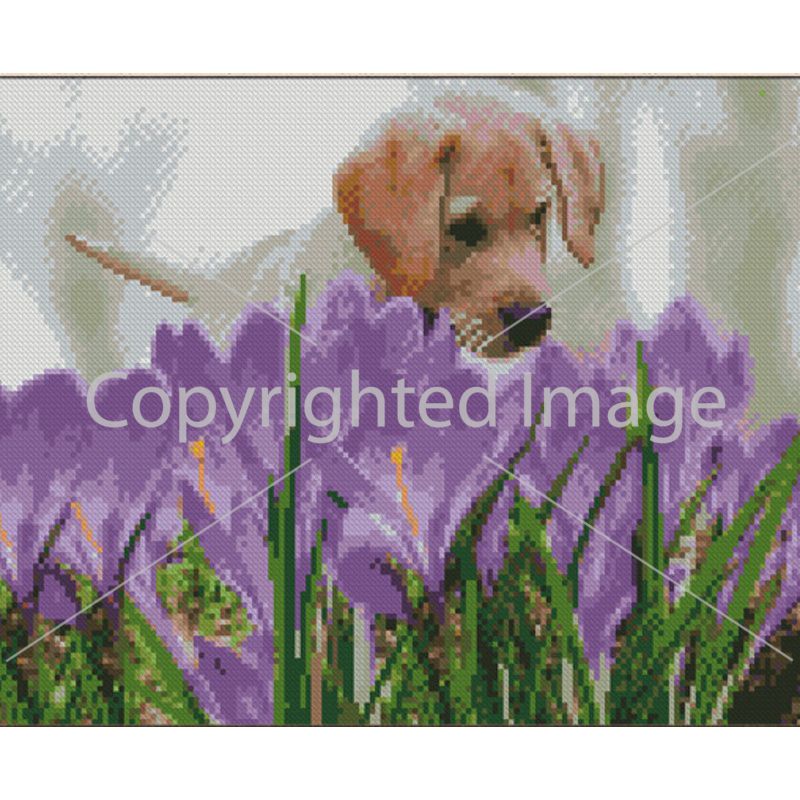 Алмазна мозаїка Strateg ПРЕМІУМ Песик над фіолетовими квітами розміром 30х40 см (KB021)
