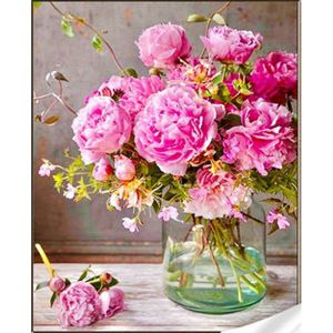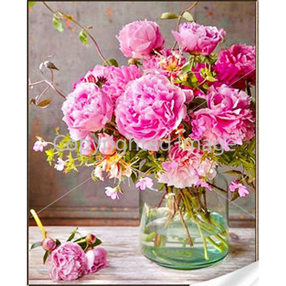 Алмазна мозаїка Strateg ПРЕМІУМ Півонії в затишному інтер'єрі розміром 30х40 см (HEG86882)