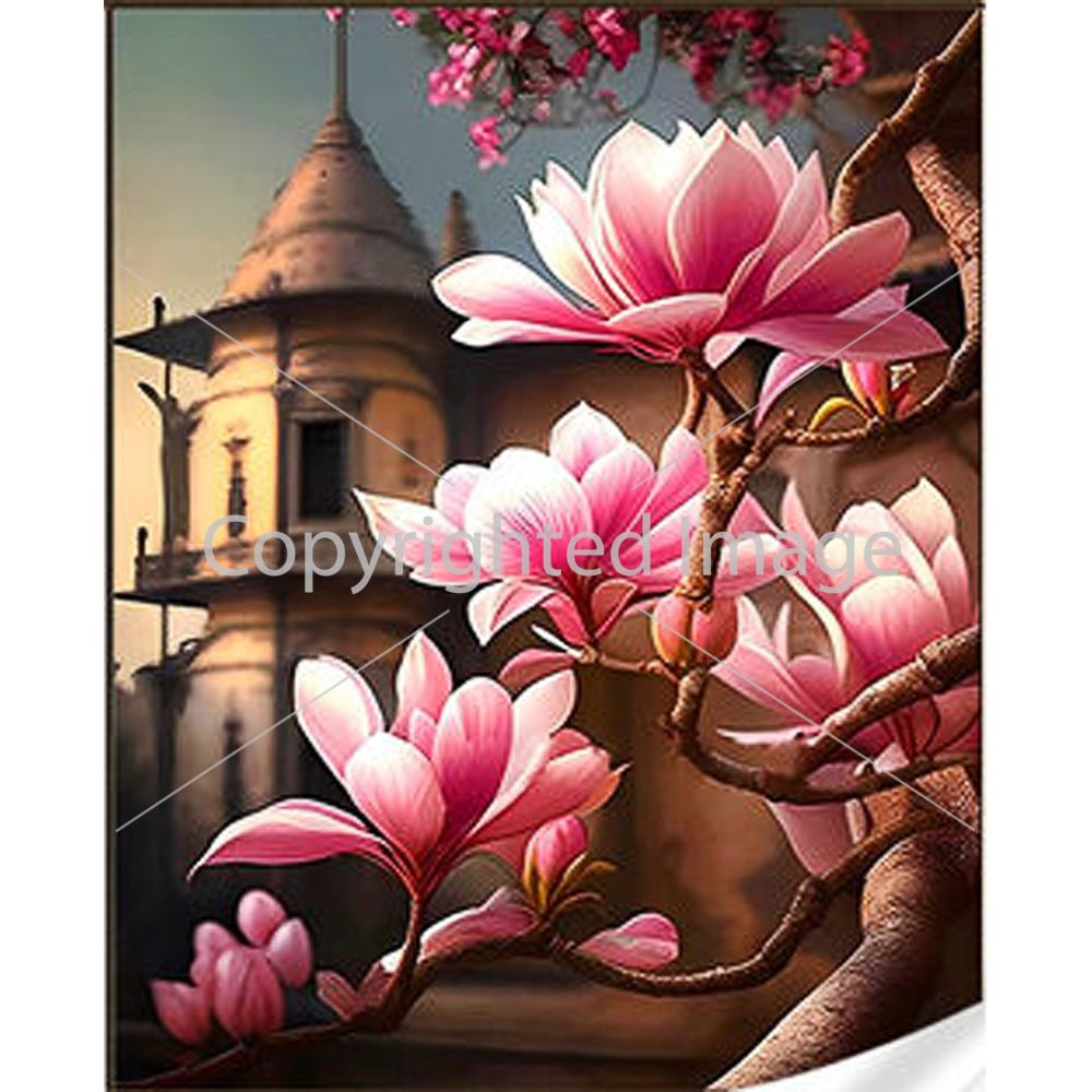 Алмазна мозаїка Strateg ПРЕМІУМ Сакура на фоні китайської пагоди розміром 30х40 см (HEG86904)