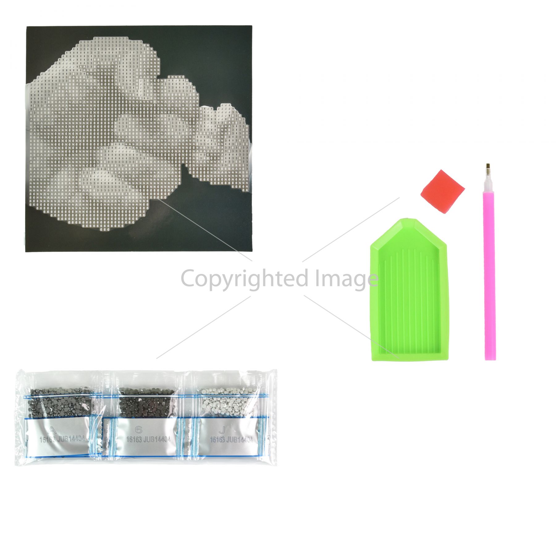 Комплектація:Полотно із клейовим шаром; акрилові стрази згідно з комплектацією набору; спеціальна ручка-стилус для роботи зі стразами; гель-клей; лоток для сортування страз.