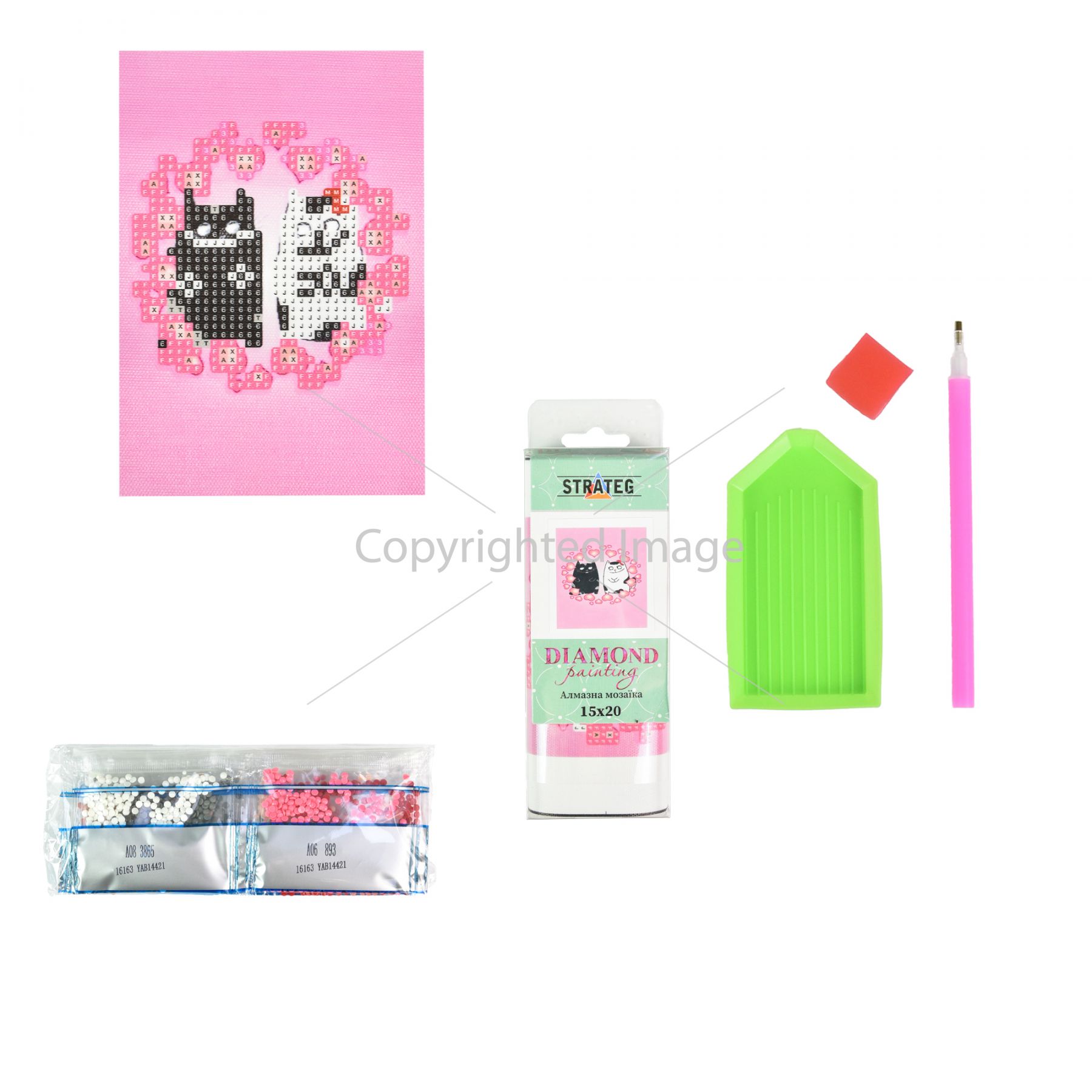 Комплектація:Полотно із клейовим шаром; акрилові стрази згідно з комплектацією набору; спеціальна ручка-стилус для роботи зі стразами; гель-клей; лоток для сортування страз.