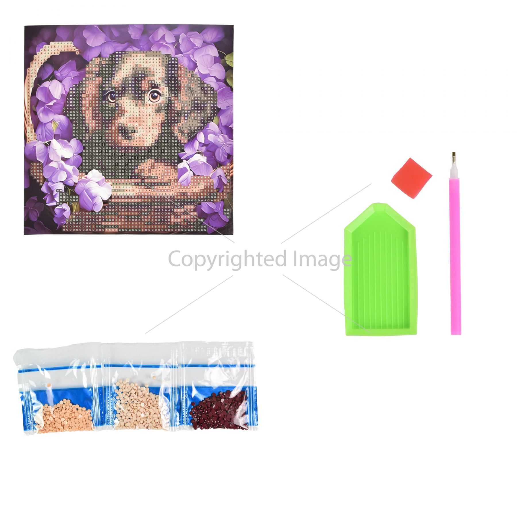 Комплектація:Полотно із клейовим шаром; акрилові стрази згідно з комплектацією набору; спеціальна ручка-стилус для роботи зі стразами; гель-клей; лоток для сортування страз.