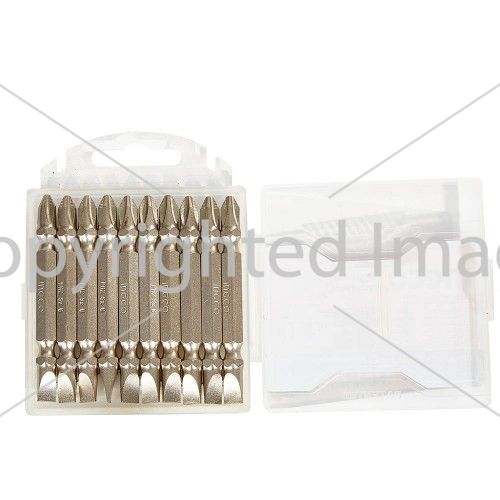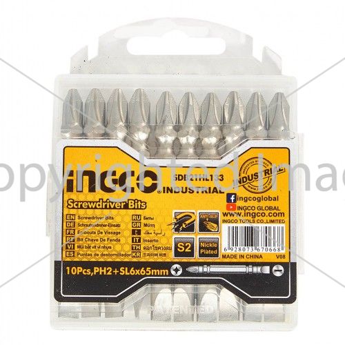 Біти S2 двосторонні PH2 + SL6х65 мм, 10 шт INGCO з шестигранником виготовлені з високоякісної сталі S2. Мають нікелеве покриття і намагнічування.