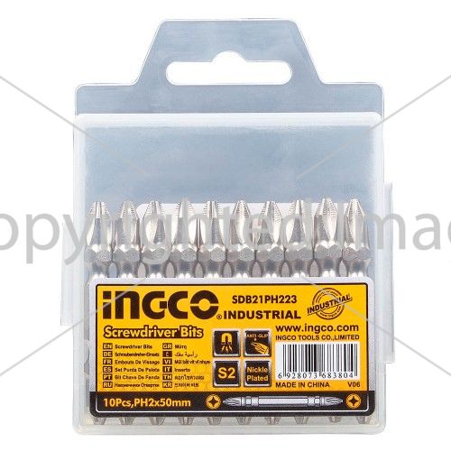 Біти S2 двосторонні PH2х50 мм, 10 шт INGCO з шестигранником виготовлені з високоякісної сталі S2. Мають нікелеве покриття і намагнічування.