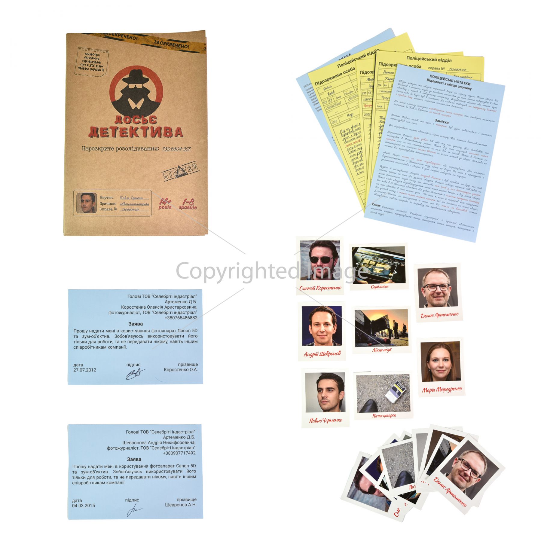 Комплектація:коробка-папка (виготовлена з картону), документи - 10 шт (виготовлені з паперу), фотографії - 5 шт (виготовлені з паперу), докази - 3 шт (виготовлені з паперу).