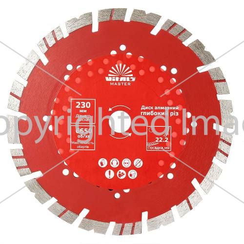 Диск алмазний Vitals Master Глибокий різ 230×22,2×12 мм призначений для роботи з такими будівельними матеріалами, як: бетон, залізобетон, тротуарна плитка, цегла, граніт, камінь, черепиця.