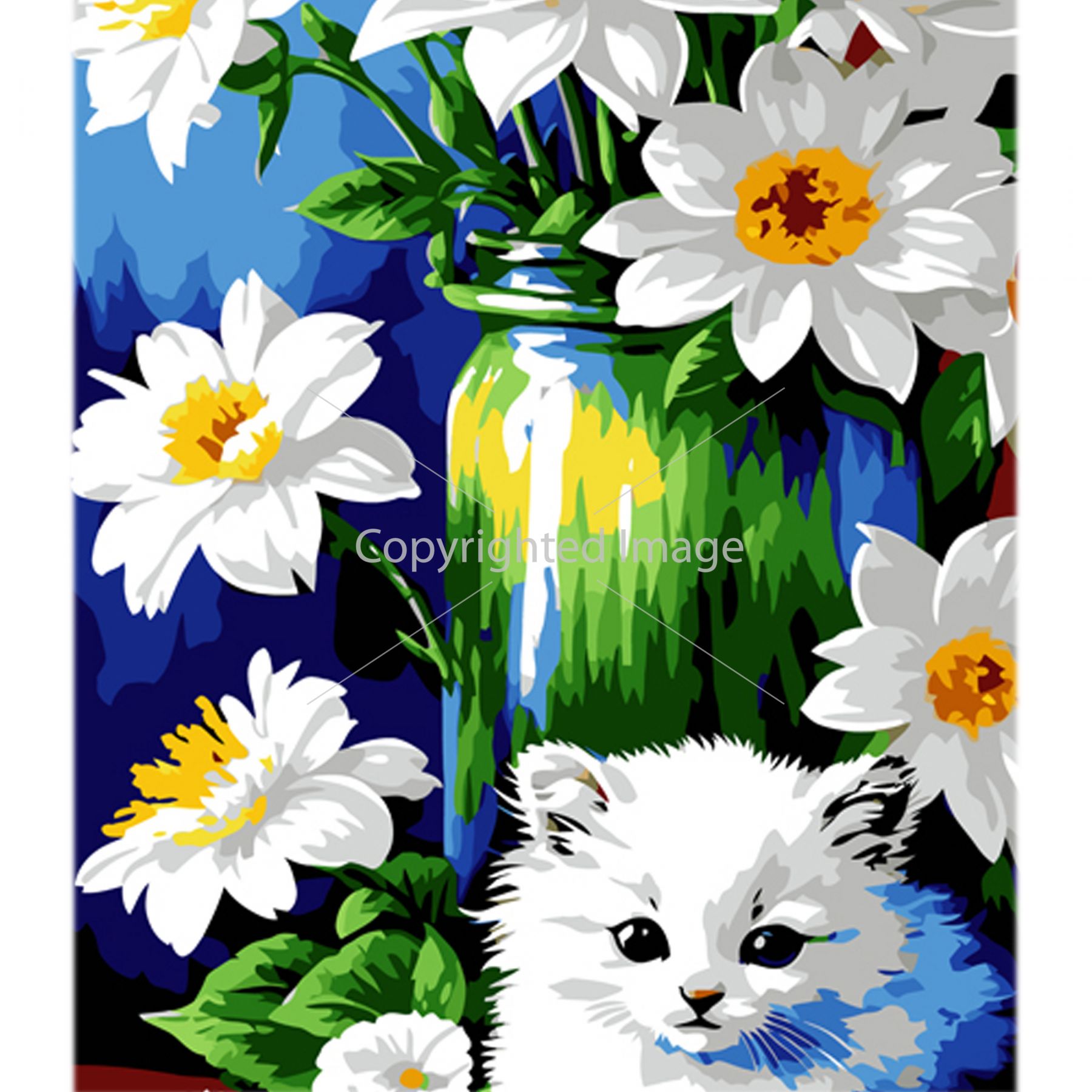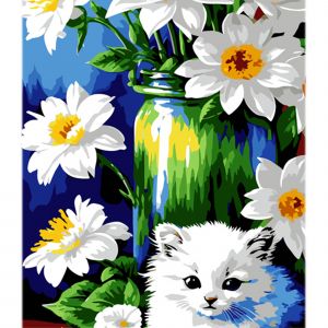 Картина за номерами Strateg Кошеня серед нарцисів на кольоровому фоні розміром 40х50 см (MZ043)