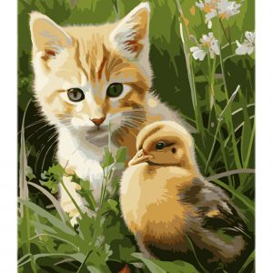 Картина за номерами Strateg Котик і каченя у милій дружбі на кольоровому фоні розміром 40х50 см (MZ011)