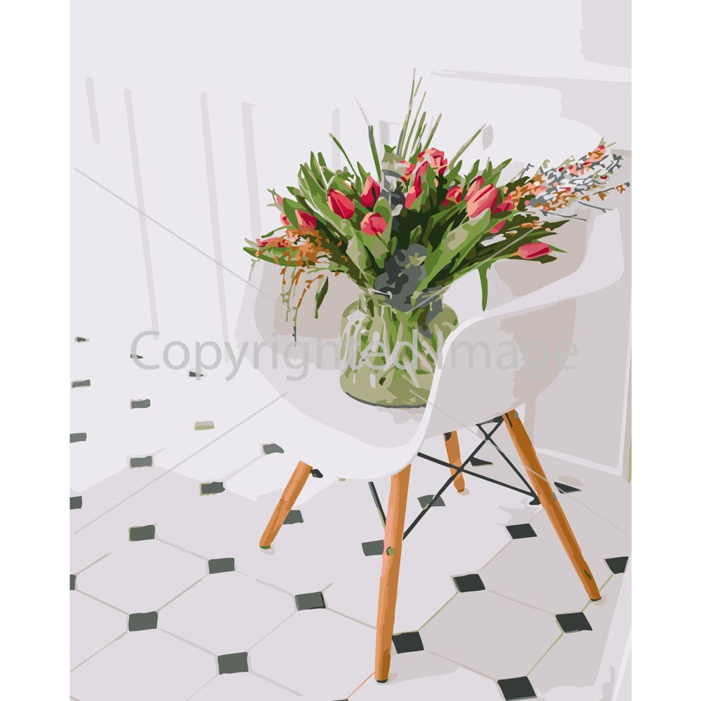 Картина за номерами Strateg ПРЕМІУМ Букет тюльпанів на стільці розміром 40х50 см (GS271)