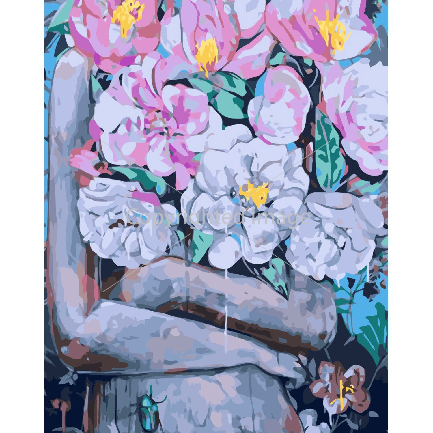 Картина за номерами Strateg ПРЕМІУМ Букет в обіймах дівчини з лаком розміром 40х50 см VA-3304