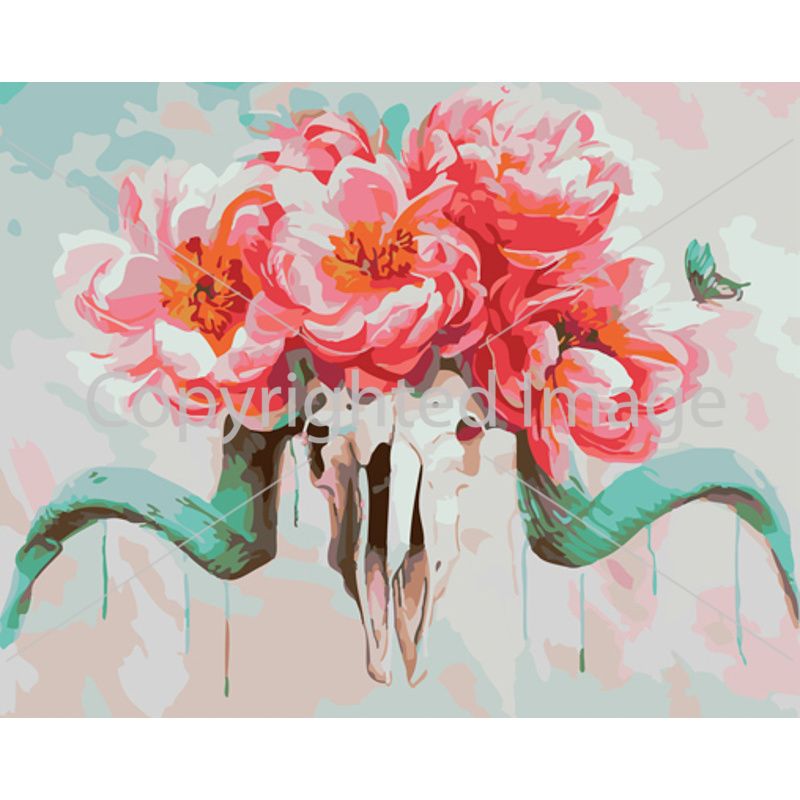 Картина за номерами Strateg ПРЕМІУМ Череп з квітами з лаком розміром 40х50 см (GS1112)