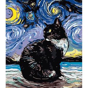 Картина за номерами Strateg ПРЕМІУМ Чорний кіт у стилі Ван Гога з лаком та з рівнем розміром 30х40 см (SS1009)