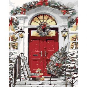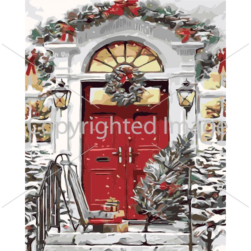Картина за номерами Strateg ПРЕМІУМ Дім з ялинкою та подарунками з лаком та з рівнем розміром 40х50 см (GS1569)