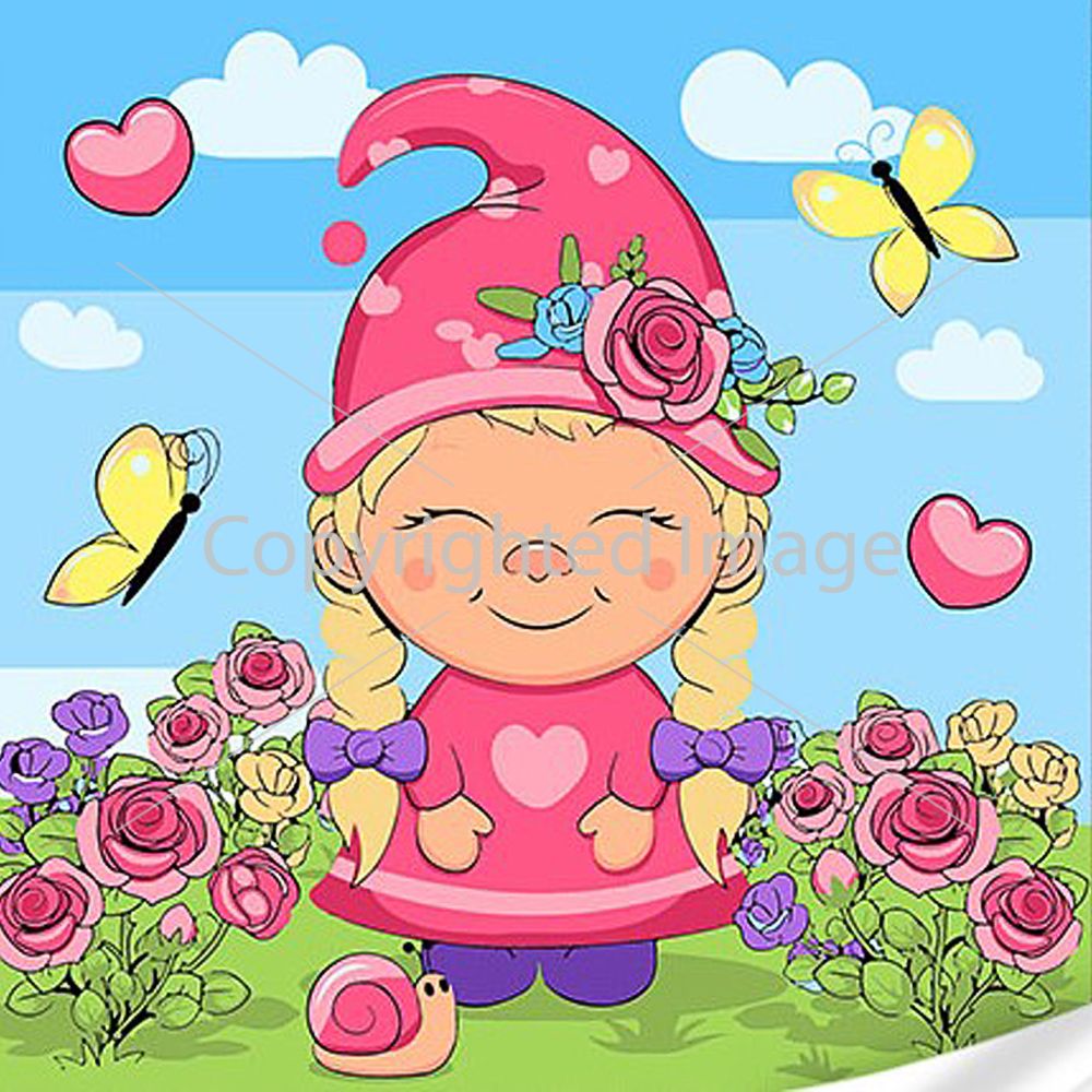 Картина за номерами Strateg ПРЕМІУМ Дівчинка гномик з лаком та з рівнем розміром 30х30 см (ES-0884)