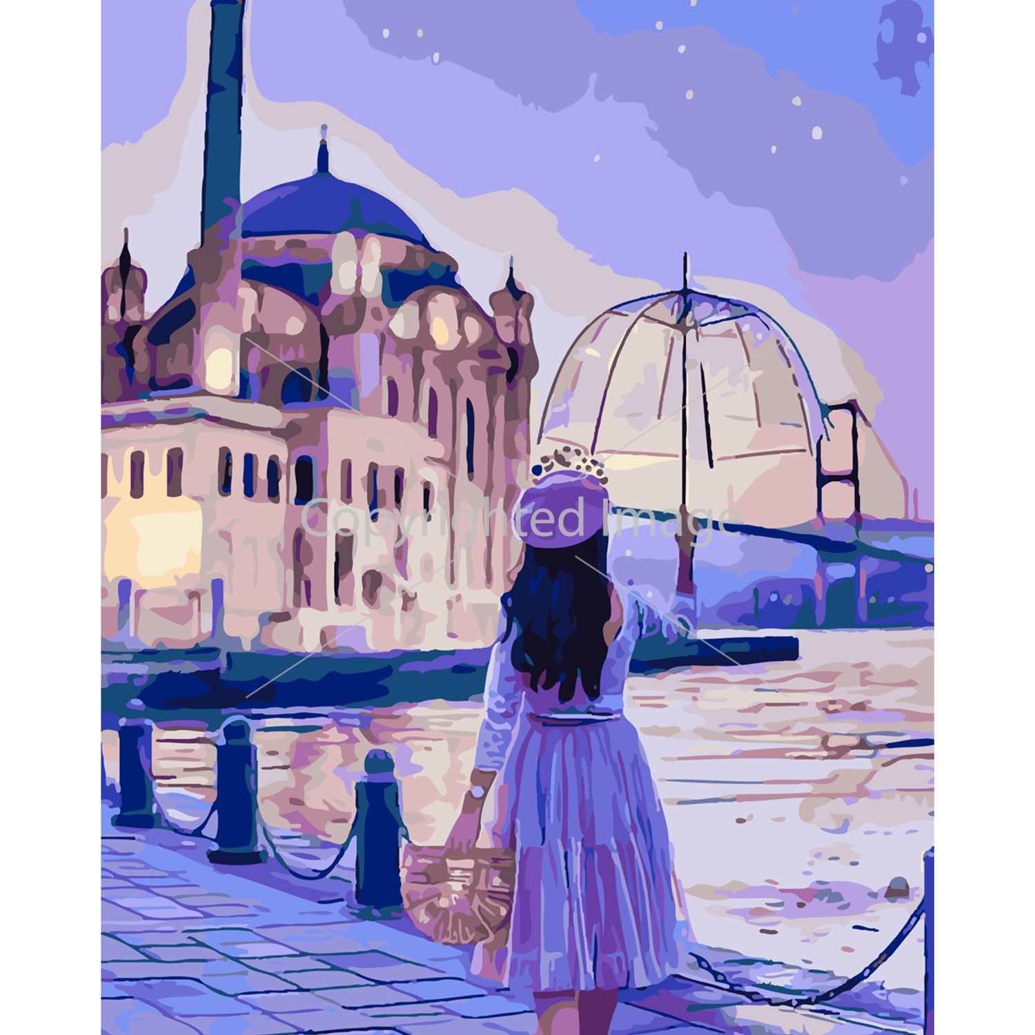 Комплектація:Контейнери з акриловими фарбами; синтетичні пензлики (3 шт.), зразок картини; полотно із розбивкою зображення за номерами; підрамник; кріплення;лак.