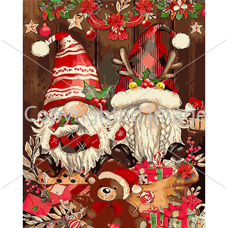 Картина за номерами Strateg ПРЕМІУМ Гноми в подарунках з лаком та з рівнем розміром 40х50 см (GS1549)