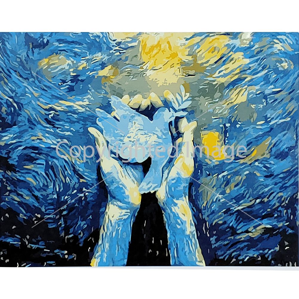 Картина за номерами Strateg ПРЕМІУМ Голуб миру в долонях з лаком розміром 40х50 см (SY6934)