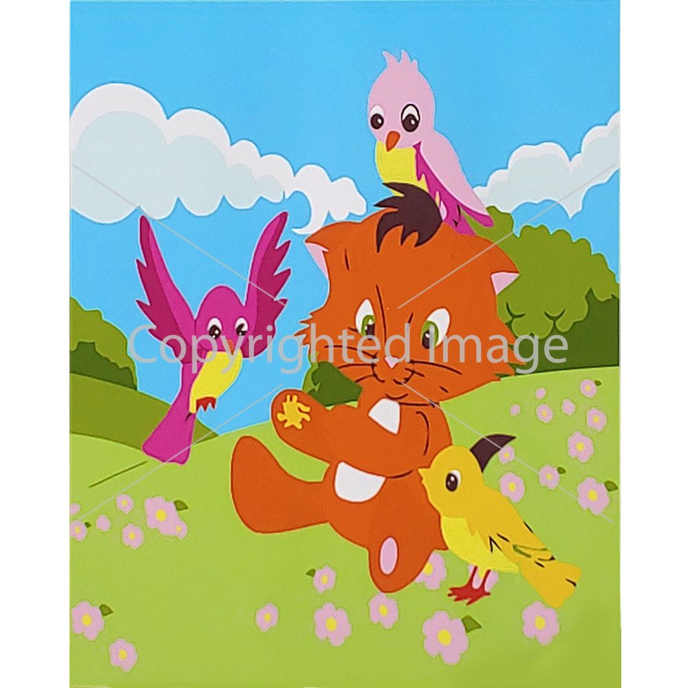 Картина за номерами Strateg ПРЕМІУМ Грайливе котеня з пташками з лаком та з рівнем розміром 30х30 см (ES194)