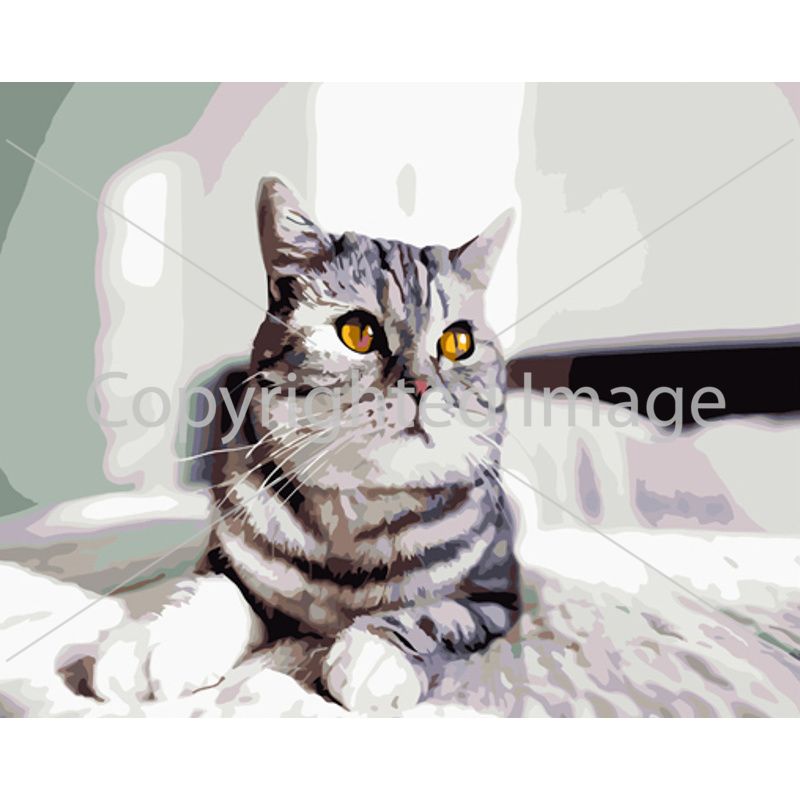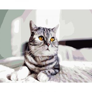 Картина за номерами Strateg ПРЕМІУМ Грайливий сірий кіт з лаком розміром 40х50 см (GS1335)