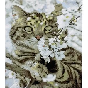 Картина за номерами Strateg ПРЕМІУМ Кіт у цвіті дерева з лаком розміром 30х40 см (SS-6536)
