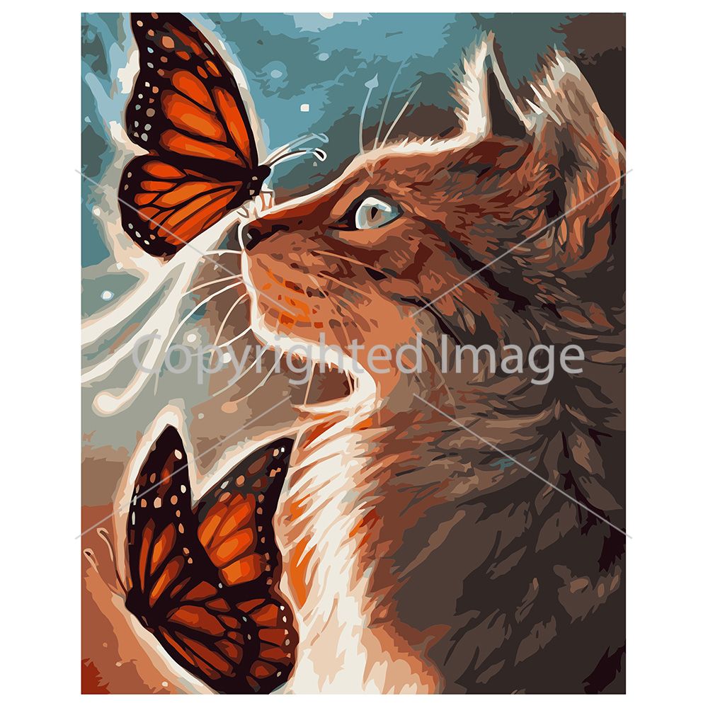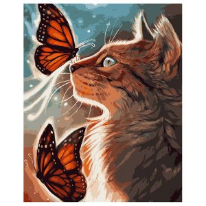 Картина за номерами Strateg ПРЕМІУМ Кіт з метеликами з лаком розміром 40х50 см VA-1025