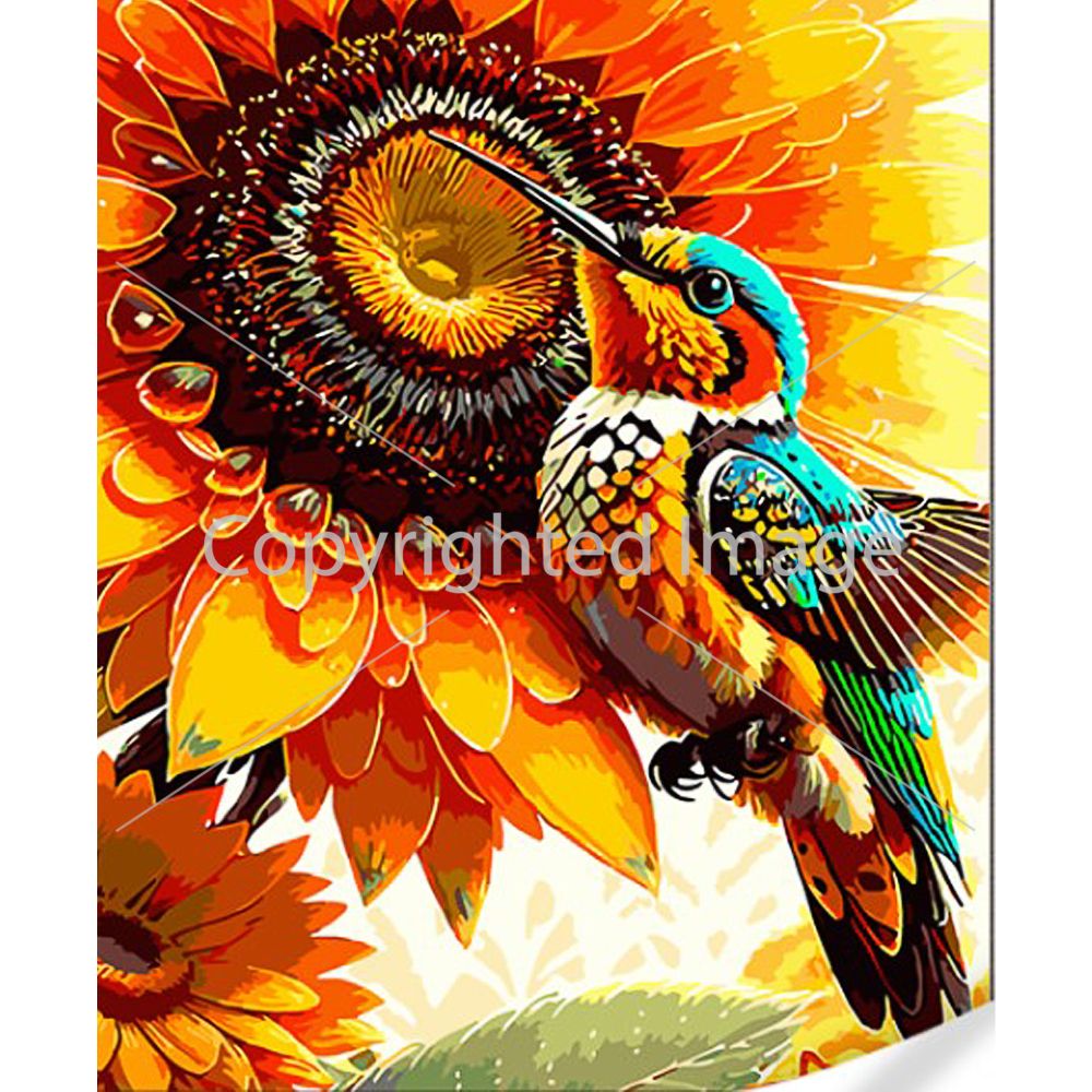 Картина за номерами Strateg ПРЕМІУМ Колібрі в соняшниках з лаком та з рівнем розміром 40х50 (GS1593)