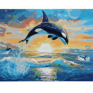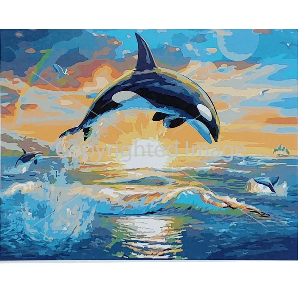 Картина за номерами Strateg ПРЕМІУМ Косатка на заході з лаком розміром 40х50 см (SY6915)