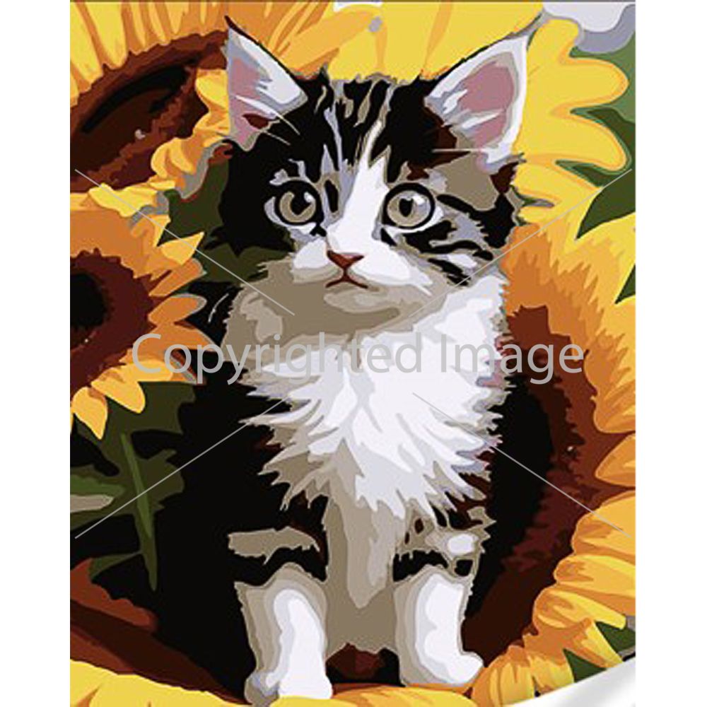 Картина за номерами Strateg ПРЕМІУМ Кошеня в соняхах з лаком та з рівнем розміром 30х40 см (SS1131)