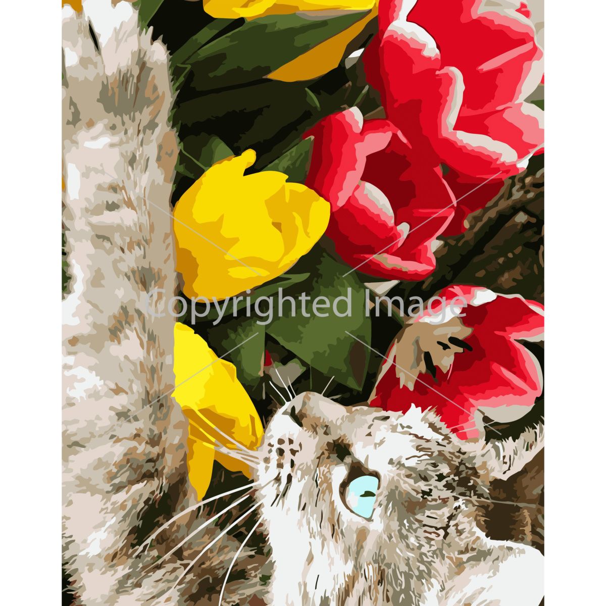 Картина за номерами Strateg ПРЕМІУМ Котик з тюльпанами з лаком розміром 40х50 см (SY6810)