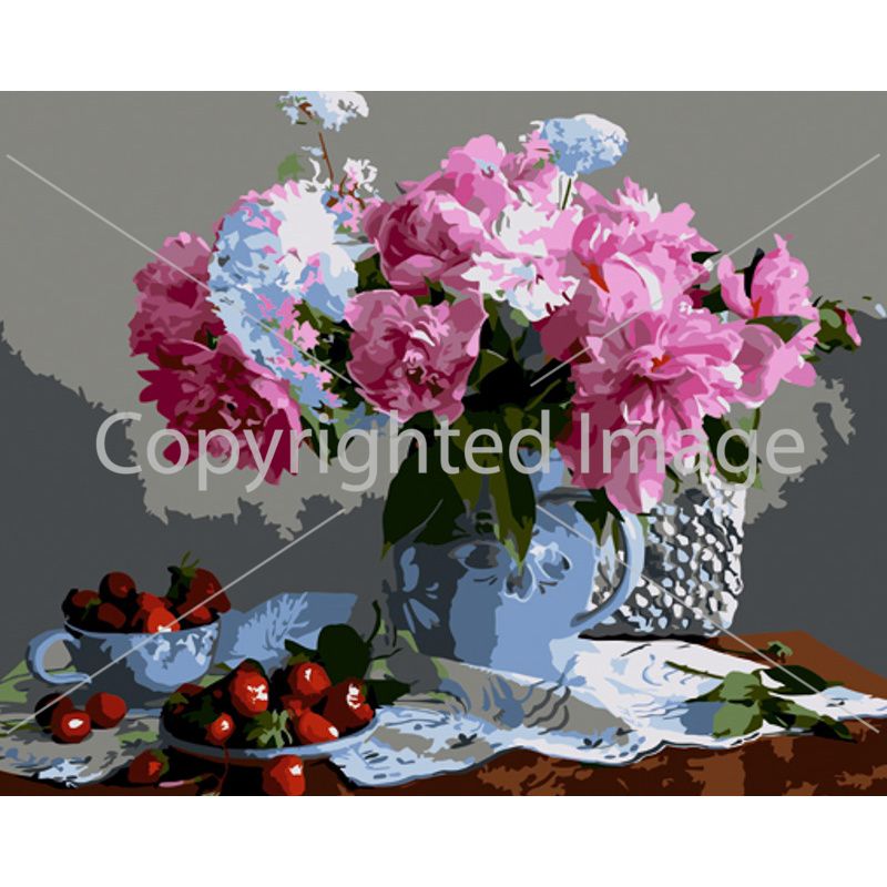 Картина за номерами Strateg ПРЕМІУМ Квіти та полуниця з лаком розміром 40х50 см (GS1128)