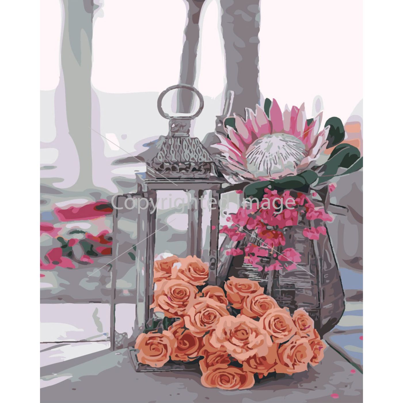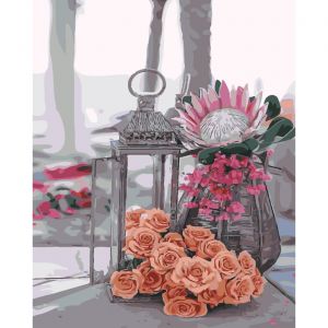 Картина за номерами Strateg ПРЕМІУМ Ліхтарик і квіти з лаком розміром 40х50 см SY6452