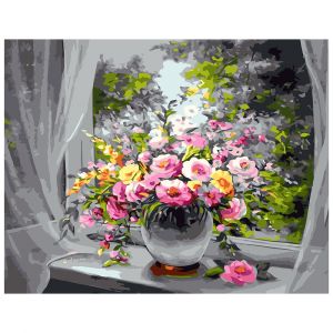 Картина за номерами Strateg ПРЕМІУМ Літній букет на білому підвіконні з лаком розміром 40х50 см VA-1597
