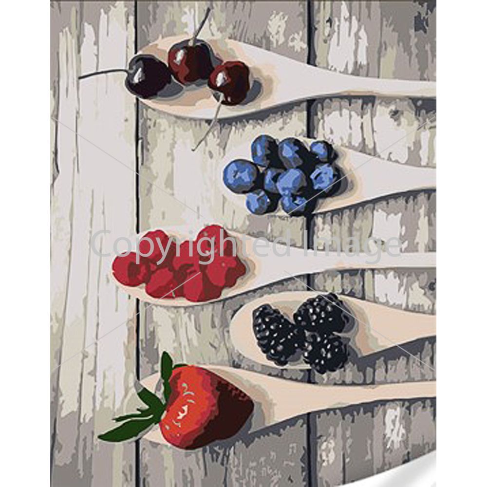 Картина за номерами Strateg ПРЕМІУМ Ложечки фруктів з лаком та з рівнем розміром 30х40 см (SS1122)