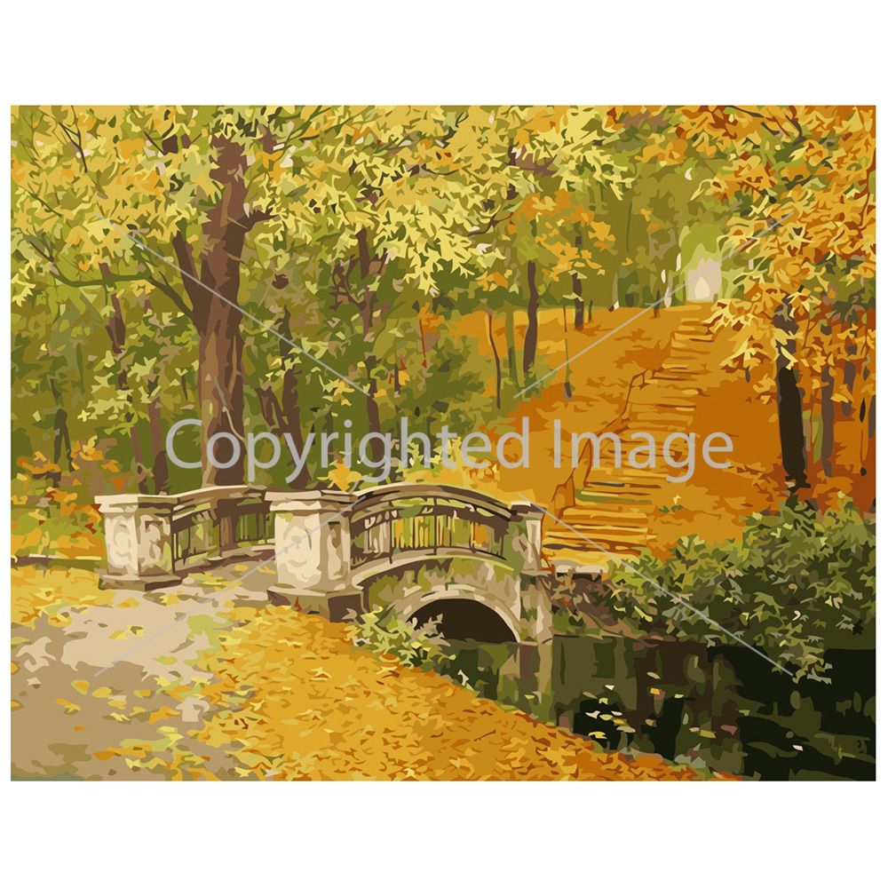 Картина за номерами Strateg ПРЕМІУМ Міст в осінь з лаком розміром 40х50 см VA-0277