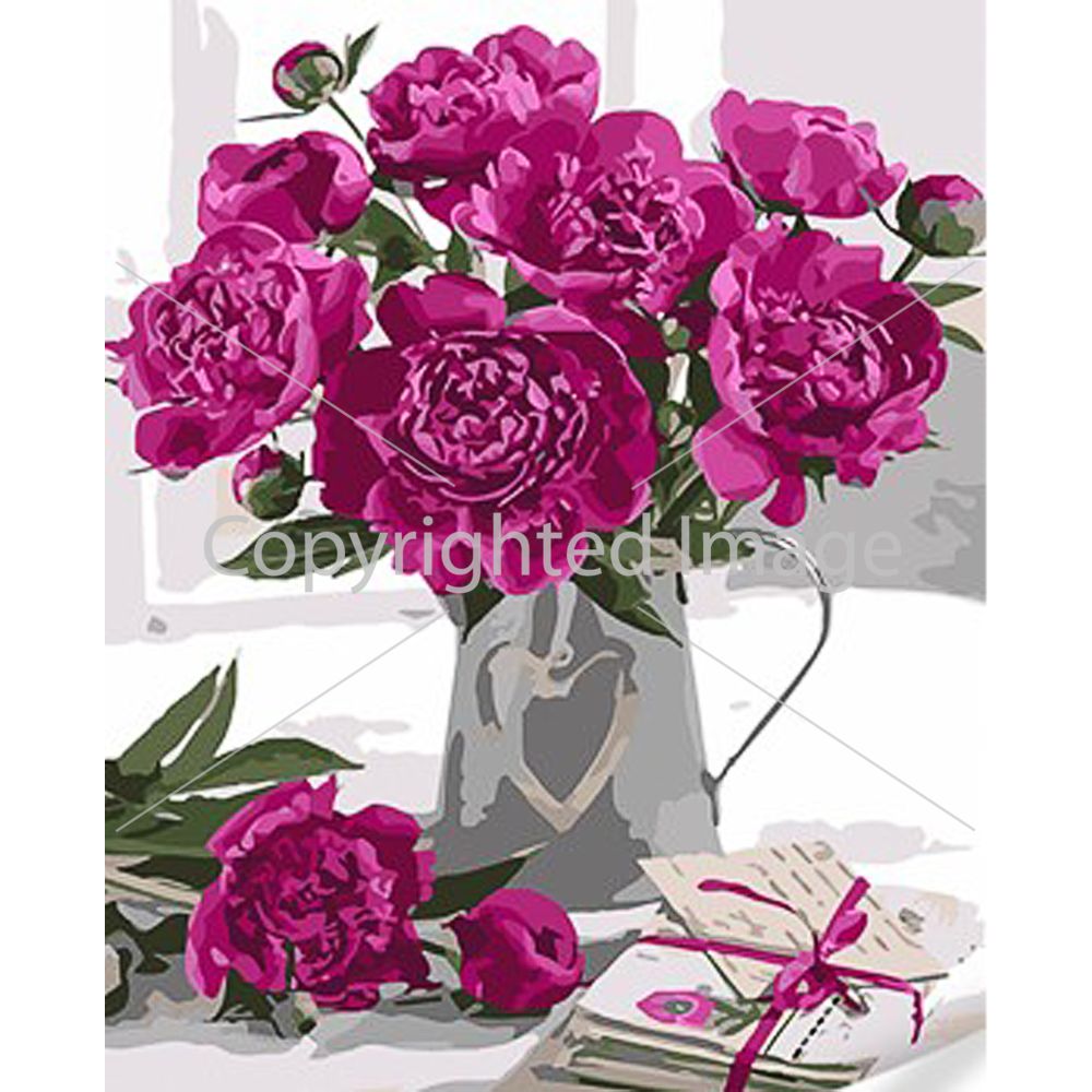 Картина за номерами Strateg ПРЕМІУМ Ніжні півонії у вазі з лаком та з рівнем розміром 30х40 см (SS1139)