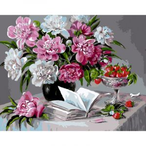 Картина за номерами Strateg ПРЕМІУМ Піони та полуниця з лаком розміром 40х50 см (GS1127)