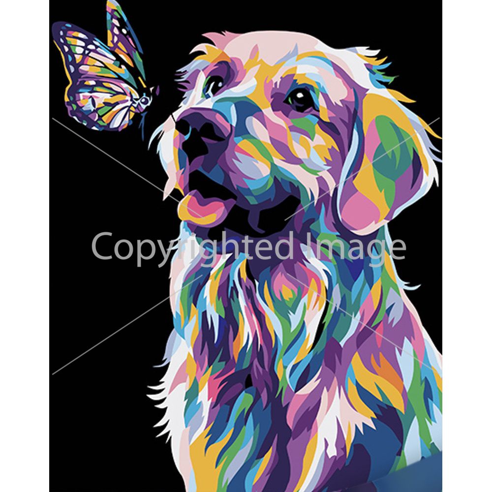 Картина за номерами Strateg ПРЕМІУМ Поп-арт собака з метеликом на чорному фоні розміром 40х50 см (AH1047)