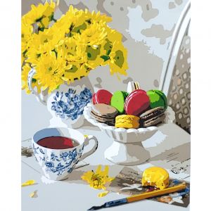 Картина за номерами Strateg ПРЕМІУМ Ранкові макаруни з квітами розміром 40х50 см (GS063)