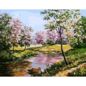 Картина за номерами Strateg ПРЕМІУМ Річка серед квітучих дерев з лаком розміром 40х50 см SY6610