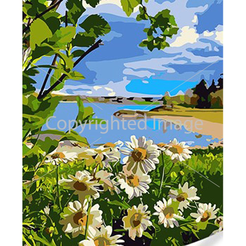 Картина за номерами Strateg ПРЕМІУМ Ромашки на березі озера з лаком та з рівнем розміром 30х40 см (SS1033)