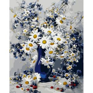 Картина за номерами Strateg ПРЕМІУМ Ромашки в синій вазі з лаком розміром 40х50 см (GS1151)